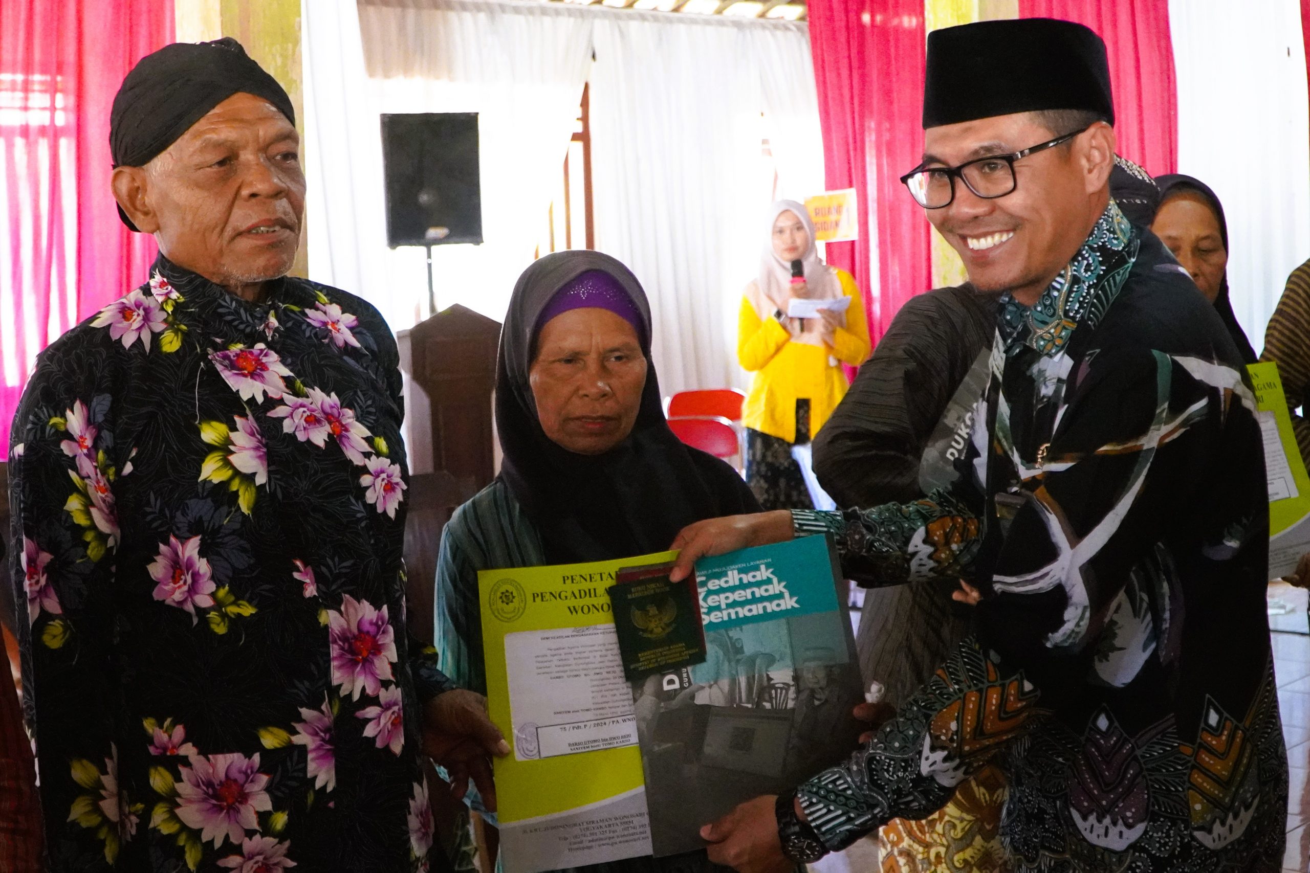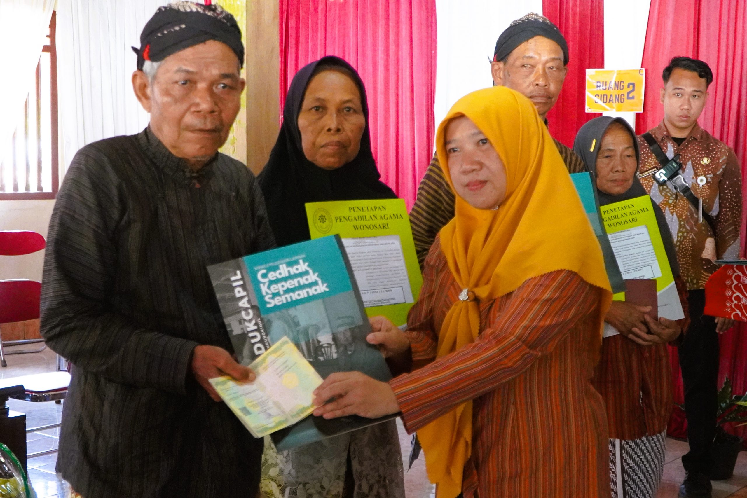 Penyerahan simbolis ini dilakukan kepada enam pasangan oleh Bupati Gunungkidul, Plt. Kepala Bagian Kependudukan Biro Tapem Setda DIY, Ketua Pengadilan Agama Wonosari, Kepala Kantor Kementerian Agama Kabupaten Gunungkidul, Panewu Saptosari, dan Lurah Kepek Kapanewon Saptosari.