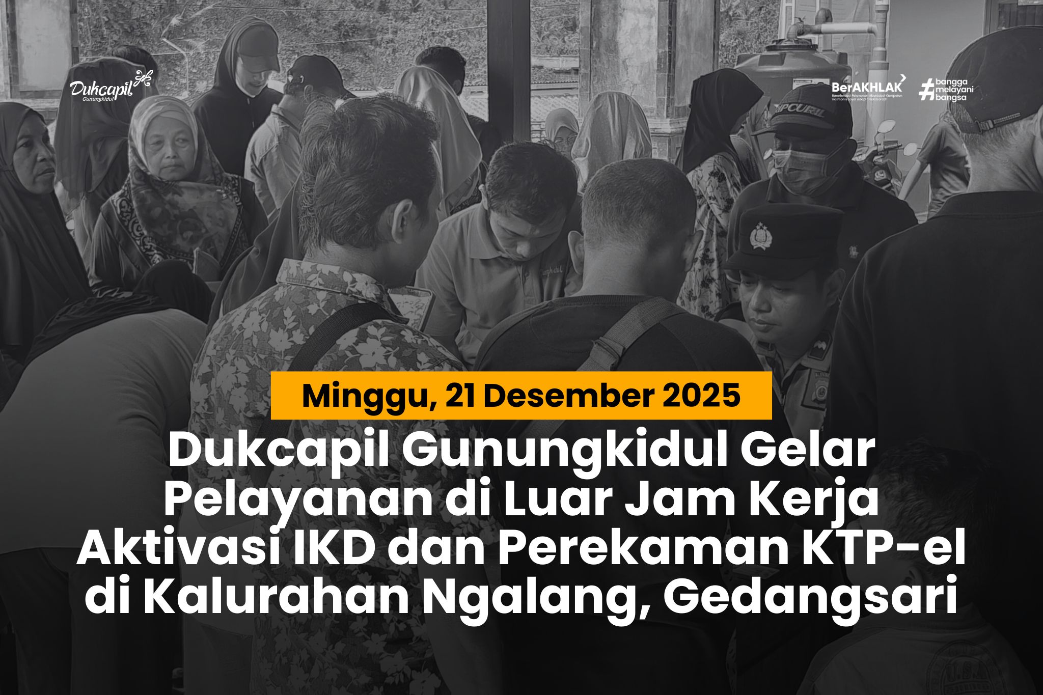 Dinas Kependudukan dan Pencatatan Sipil (Dukcapil) Kabupaten Gunungkidul kembali melaksanakan Pelayanan di Luar Jam Kerja berupa aktivasi Identitas Kependudukan Digital (IKD) dan perekaman Kartu Tanda Penduduk Elektronik (KTP-el). Kegiatan ini dilaksanakan pada Minggu, 21 Desember 2025, bertempat di Balai Kalurahan Ngalang, Kapanewon Gedangsari.