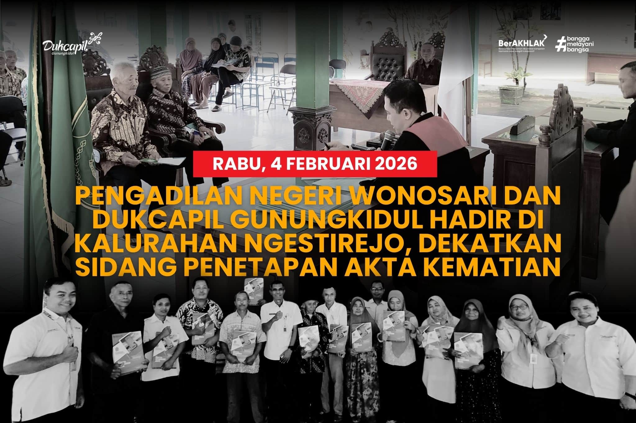 Dinas Kependudukan dan Pencatatan Sipil Kabupaten Gunungkidul bekerja sama dengan Pengadilan Negeri Wonosari serta Pemerintah Kalurahan Ngestirejo melaksanakan kegiatan Pelayanan Sidang Akta Kematian Terpadu (SIAKMADU) pada Rabu, 4 Februari 2026. Kegiatan ini bertempat di Balai Kalurahan Ngestirejo, Kapanewon Tanjungsari, sebagai upaya mendekatkan layanan hukum dan administrasi kependudukan kepada masyarakat.